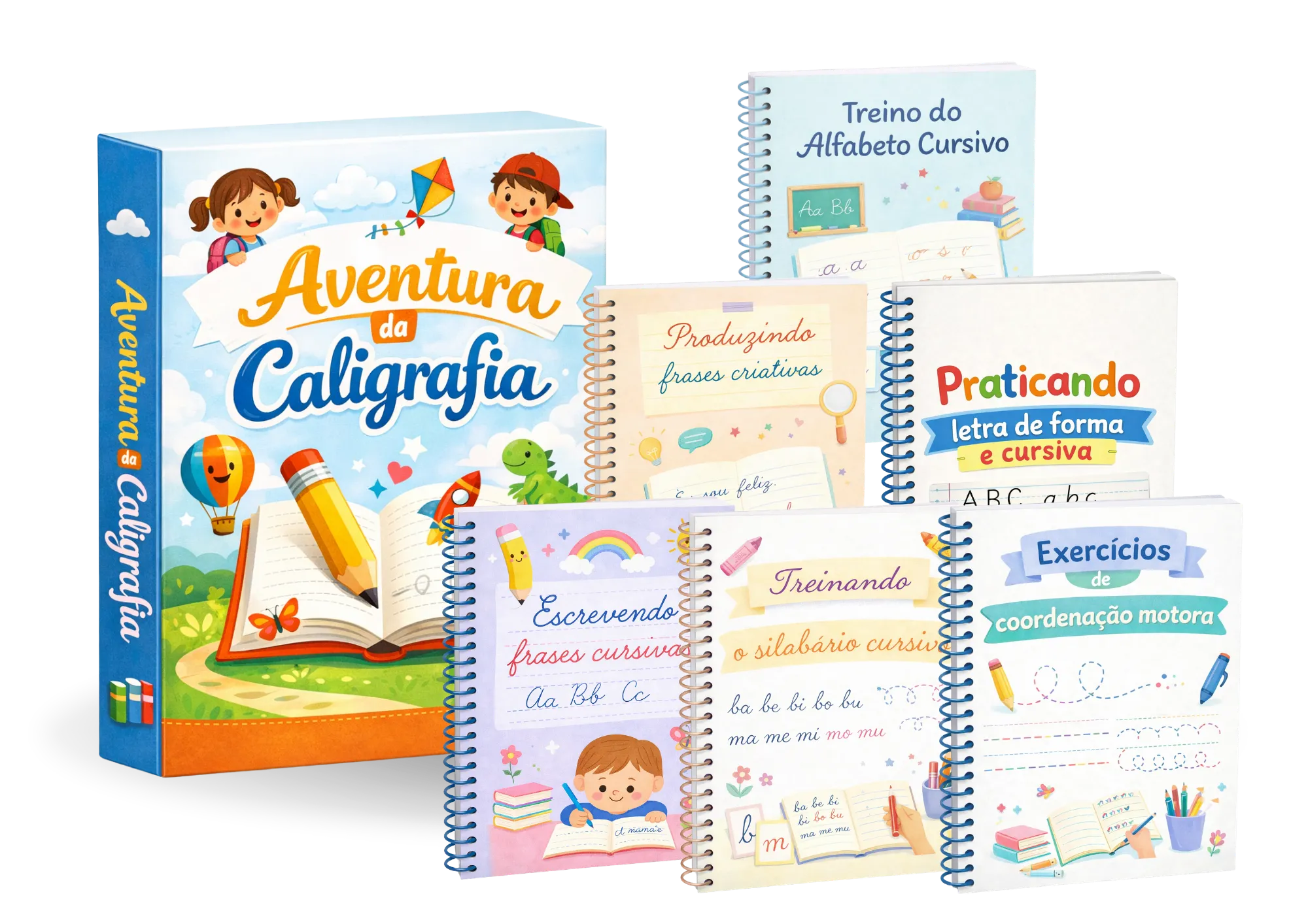 Kit completo para ajudar crianças do 1º ao 6º ano a desenvolverem letra de forma e cursiva com mais capricho, fluidez, organização e confiança.