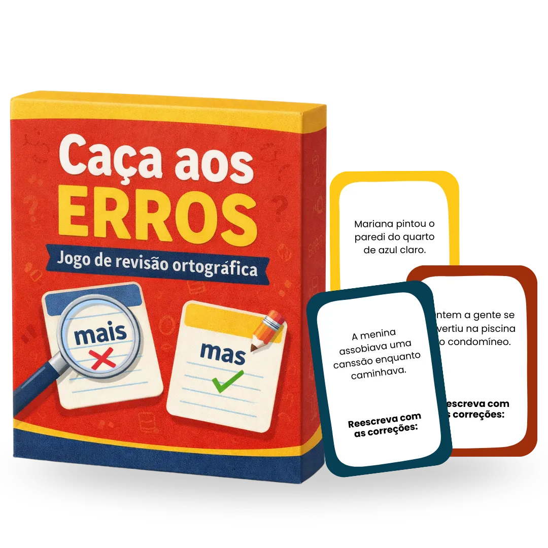 Baralho em pdf com 50 mini-histórias e situações escritas com erros ortográficos para os alunos revisarem e aprenderem a ortografia de forma divertida.