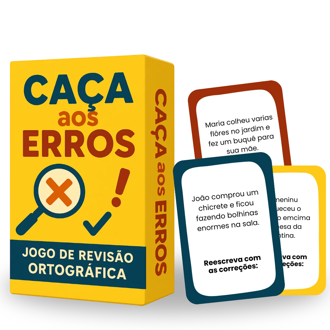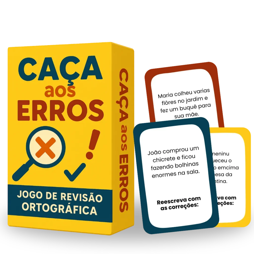 Jogo de cartas em pdf com 50 mini-histórias e situações escritas com erros ortográficos para os alunos revisarem e aprenderem a ortografia de forma divertida.